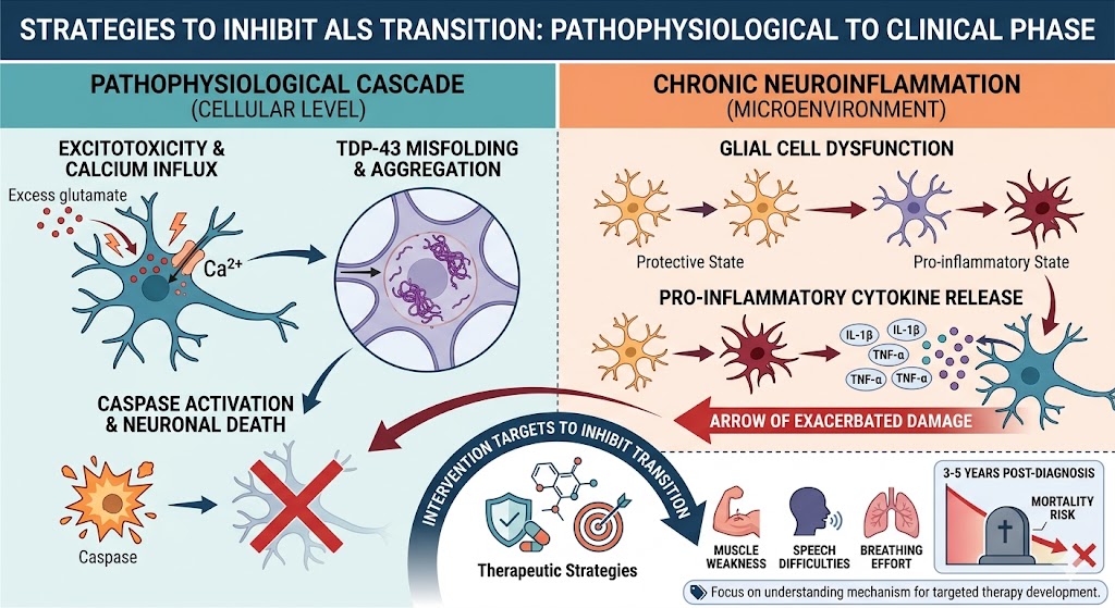 Sequential pathophysiological transitions in ALS are characterized by the malfunction and subsequent death of motor neurons that occur due to the series of pathological biological errors. The initial event involves the formation of aggregates of misfolded, toxic TDP-43 proteins, packed within the cytoplasm of the neurons. This is the result of the over excitation caused by glutamate leading the neurons to an influx of calcium, caspase and neuronal death. These toxic aggregates of proteins lead the patients to weakness in the muscles that is focal but then causes the loss of control of the functions of speech, swallowing and the effort to breathe in an autonomic manner. The impact on life quality is devastating, marked by a heightened mortality risk of 3 to 5 years after diagnosis. Physical symptomatology notwithstanding, there is a scientific explanation for why the quality of life is impacted. Cellular tissues as an environment for many cells are subjected to chronic neuroinflammation. Glial cells, meant for the protection of the brain, begin the process of destruction by giving the green light for the formation of pro-inflammatory cytokines, which pose an even more significant risk to neurons as the destruction is exacerbated. This novel cycle of destruction exacerbates the disease’s proneness to therapeutic inefficacy based on single-target pharmacology, shifting the scientific focus toward Anti-Aging Stem Cell Nutrition.