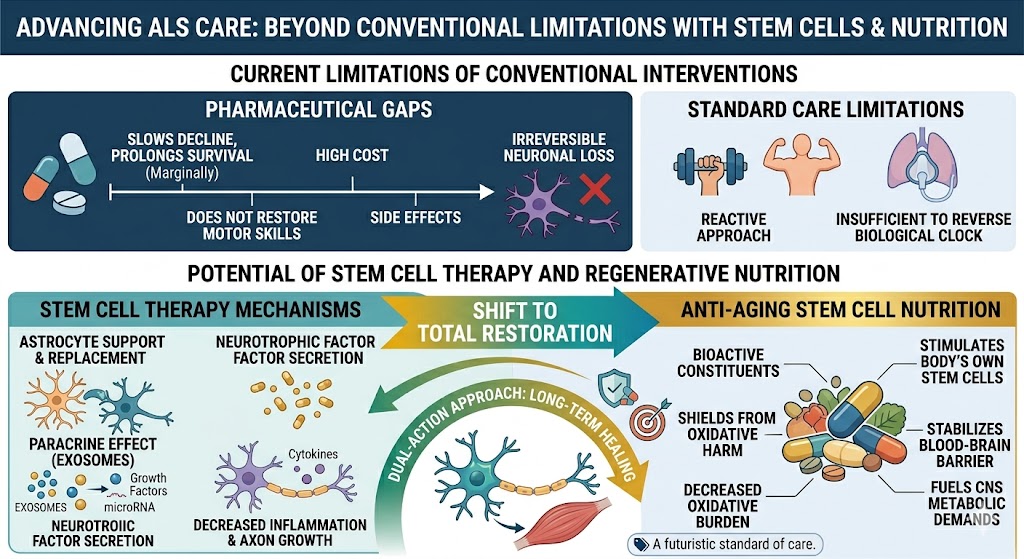 Conventional, traditional, medically approved therapeutic methods for the management of ALS, in most cases, depend on the use of pharmaceuticals like Riluzole or Edaravone. These conductors of change from the pharmaceutical world facilitate a marginally prolonged survival or a gradual deceleration of the phenomenon of functional decline. Nevertheless, none of them present any impact or significant rejuvenation of lost motor skills. The gaps these therapies possess are a projection of the irreversibly lost neurons or the fact that the neuronal architecture remains diseased and irreparably healed. To many patients, the side effects of the drugs, as well as the high cost of lifelong use, become even bigger issues. Standard Physical therapy or respiratory support are aimed at mediation and remain proactive in nature. The gaps of the pharmaceutical therapies and the reactive nature of these therapeutic regimes, are gaps that the medical community admits. Although the therapies that are used are a necessary standard of care, they are insufficient to reverse the biological clock of neuronal aging and death without the adjunct benefits of Anti-Aging Stem Cell Nutrition.