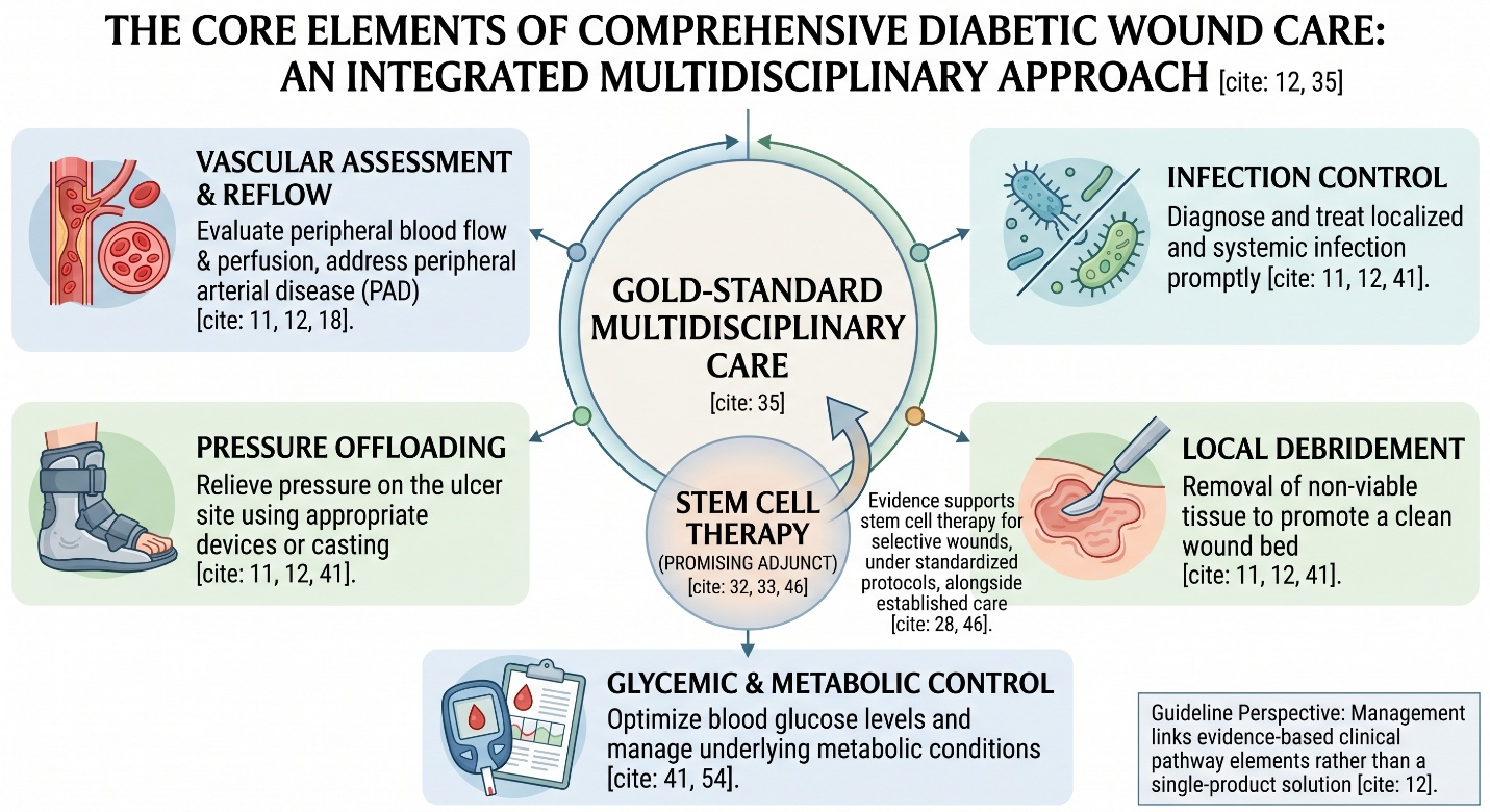 This matters because the strongest wound-healing studies do not suggest that stem cells replace standard care. IWGDF’s 2023 wound-healing guideline explicitly states that interventions to improve healing should be used in conjunction with established aspects of gold-standard multidisciplinary care. That phrase is crucial. It means stem cell therapy, even where promising, belongs inside a wound-care system — not above it, and not instead of it.