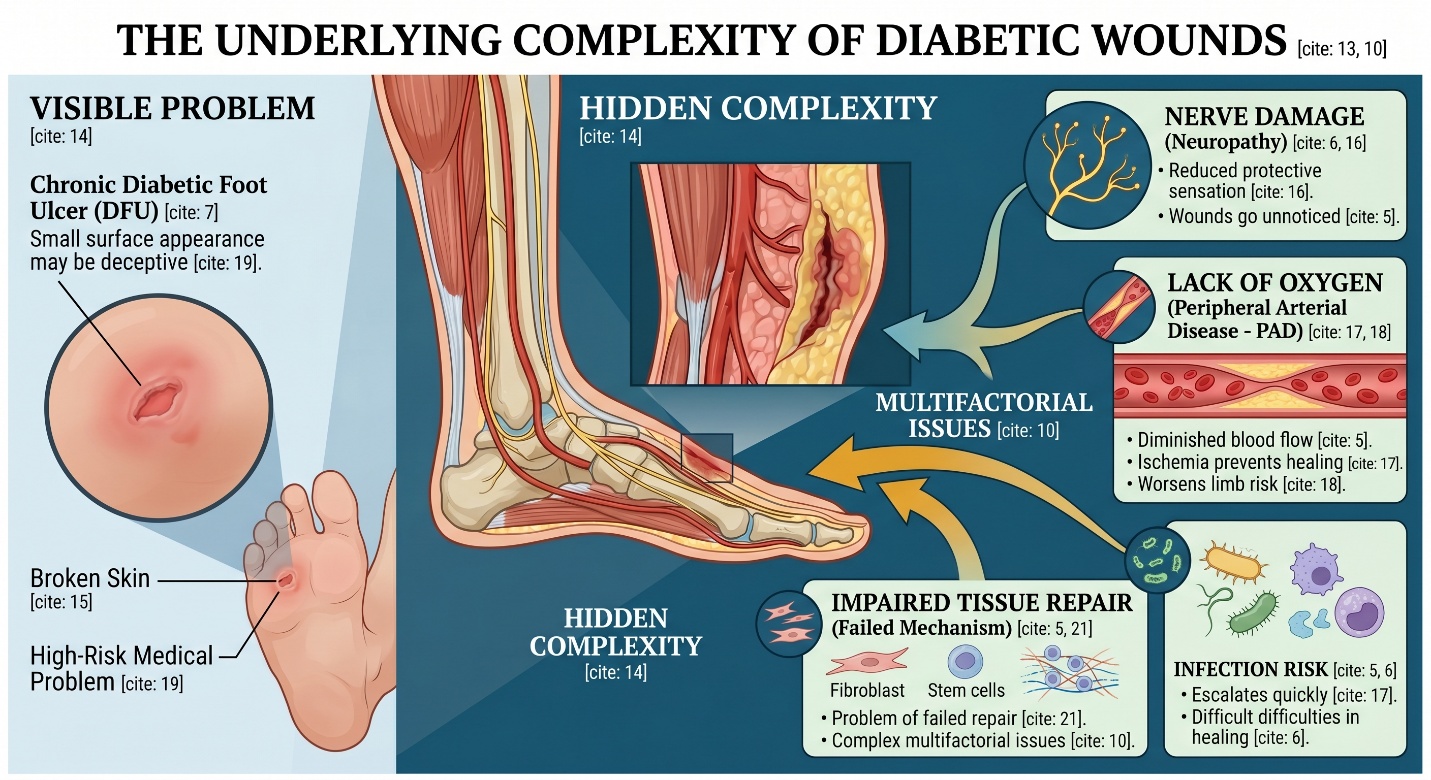 A diabetic foot ulcer or chronic lower-extremity wound is not just broken skin. It is often the surface sign of deeper metabolic and vascular trouble. Nerve injury can reduce protective sensation. Peripheral arterial disease can limit oxygen delivery. Infection can escalate quickly. IWGDF’s PAD guideline notes that about half of people with diabetes and a foot ulcer have peripheral artery disease, which significantly worsens healing and limb risk. That is why a wound that looks “small” on the outside may still behave like a high-risk medical problem.