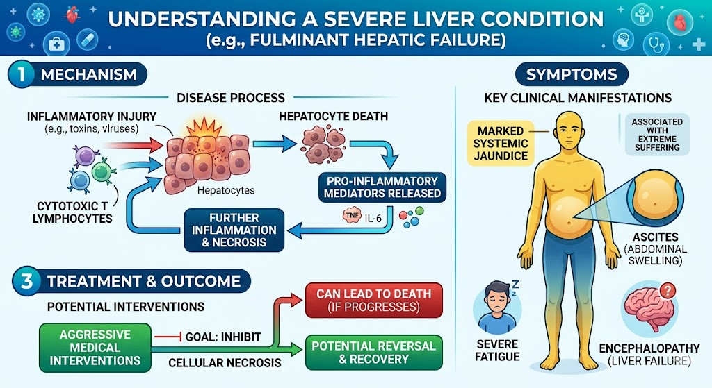 The mechanism of this condition includes the death of hepatocytes initiated by the cytotoxic T lymphocytes recruited following inflammatory injury to the cells. This leads the body to secrete pro inflammatory mediators furthering inflammation and necrosis. The condition manifests in the body as marked systemic jaundice together with large swelling of the abdomen due to presence of ascitic fluid, marked fatigue, and encephalopathy due to liver failure. This condition is associated with extreme suffering and can lead to death due to the suffering and can potentially be reversed by aggressive medical interventions to inhibit the progress of cellular necrosis.