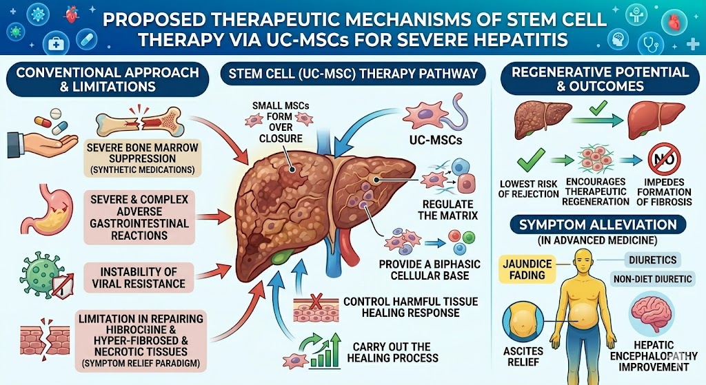 Severe hepatitis can be treated by several conventional medical therapies and advanced pharmaceuticals, including the use of immunomodulators and restorative stem cell therapy. The advanced UC-MSCs treatment methods proposed here can potentially be used to treat severe hepatitis, where function loss has caused the organ to transition to the next stage of deterioration. Medical practitioners use various methods to impede the process of viral replication and help to reduce tissue damage associated with inflammation and auto-immunity. In advanced medicine, removal of dangerous sequelae of the condition, such as ascites and hepatic encephalopathy, is treated through the use of powerful diuretics and a strict non-diet diuretic. Current treatment methods impose significant constraints. Considering the clinical therapies, severe bone marrow suppression associated with synthetic medications is also the result of a severe and complex adverse gastrointestinal reaction. The instability of viral resistance is a major clinical concern. Classical medical therapies for this condition primarily focus on the use of a symptom relief paradigm and are limited in their ability to address the biological build up associated with the repair and restoration of hyper fibrosed and necrotic tissues and organs to counter the process of hyper fibrosis affecting the organ necrosis and tissues.