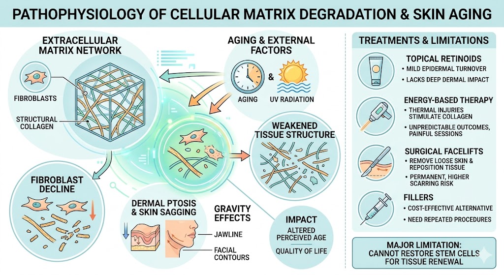 The extracellular matrix network will help spur the development of a deeper understanding of this condition. Fibroblasts contribute to the creation of structural collagen and thus experience the decline as the body continues to age. Due to the body’s support tissue structure weakening lead to dermal ptosis and Skin Sagging. This wilts under the force of gravity. The deterioration of the face continues under the force of gravity causing changes in the jawline. The severity of the condition is strongly linked to the age of the individual and extrinsic environmental reasons (ex. ultraviolet radiation). This condition affects life quality by causing differences in perceived age, or age of appearance. The interventions lead to the revival of signaling which helps regulate the elasticity of tissues and the support structure of the body. Topical retinoid applications cause mild epidermal turnover. However, they lack the ability to impact deeper reticular dermal layers. Energy-based therapy devices cause thermal injuries to stimulate new collagen within the dermis. Nevertheless, these devices yield unpredictable outcomes with the need for frequent, painful treatment sessions. Surgical facelifts can remove loose, extra skin and reposition the underlying tissue. However, facelifts are permanent and come with a higher risk for scarring than fillers. Fillers are a more cost-effective alternative but need to be performed multiple times. These treatment options are limited by the fact that they cannot restore the amount of stem cells for tissue renewal. This places a greater clinical demand for treatment options using PhytoCellTec Technology that can address the needs of dermal aging.