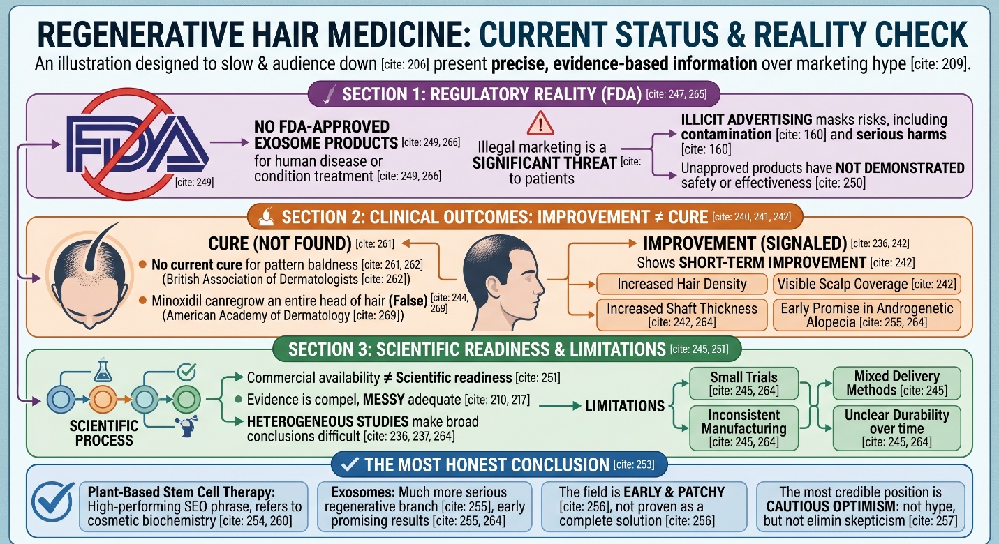 This is where the article needs its most important layer. Regenerative hair medicine is increasingly able to show short-term improvements in hair density, shaft thickness, or visible scalp coverage. But those outcomes are not the same thing as a permanent reversal of baldness. The BAD says there is no cure for male-pattern hair loss, and the AAD says minoxidil cannot regrow an entire head of hair. Even the more optimistic regenerative reviews keep returning to the same limitations: small trials, inconsistent manufacturing, mixed delivery methods, and unclear durability over time. That is why Plant-Based Stem Cell Therapy and stem cell exosomes for hair loss should be discussed as emerging approaches, not as settled answers.