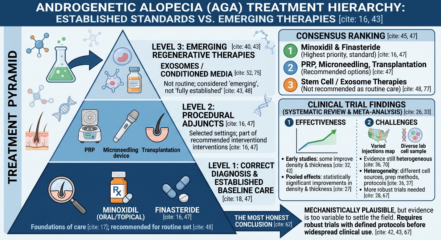A very practical way to judge the maturity of a treatment is to ask whether it appears in expert recommendations as a standard option. In a 2025 Canadian consensus on androgenetic alopecia, recommended interventions included minoxidil, finasteride, oral minoxidil, PRP, and microneedling. Stem-cell-based therapies were not part of the recommended routine set. That does not mean they have no value. It means the panel did not think the evidence was ready for that level of endorsement.