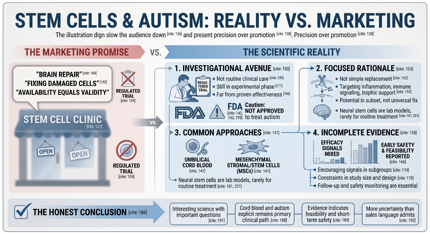 The scientific rationale has never really been about “replacing damaged brain cells” in a simple way. The more common research idea is that cord blood cells or MSCs might influence inflammation, immune signaling, trophic support, or neurodevelopment-related pathways in a subset of autistic children. That is a much narrower and more defensible claim than saying stem cells “fix” autism. Reviews of autism stem cell studies keep returning to this same point: the rationale is biologically interesting, but the mechanisms are still being worked out and the clinical evidence is still incomplete.