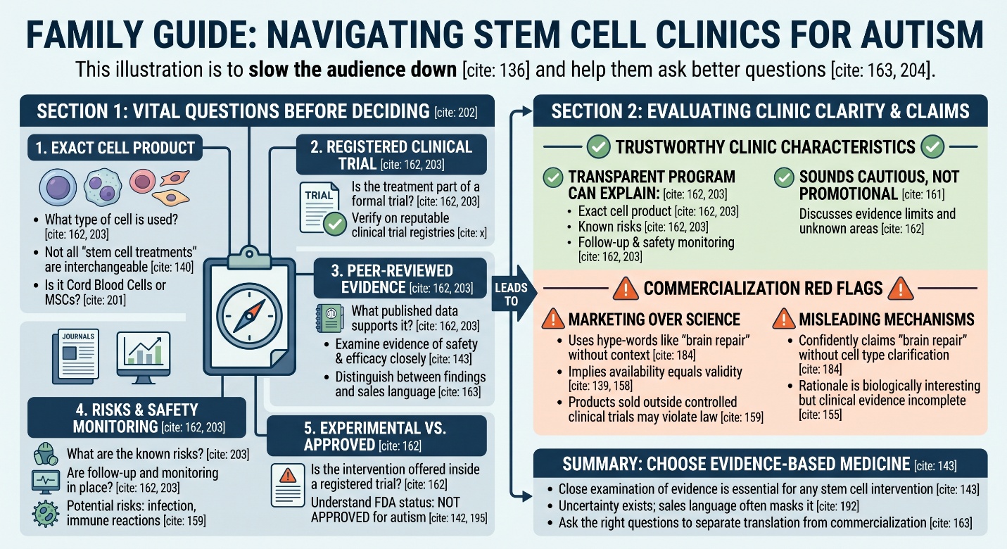 A trustworthy clinic conversation should therefore sound more cautious than promotional. It should explain what exact cell product is being discussed, whether the intervention is being offered inside a registered clinical trial, what the published evidence actually shows, what remains unknown, and what follow-up and safety monitoring are in place. That is also the spirit of the ISSCR patient guidance, which is designed to help families separate legitimate clinical translation from premature commercialization.