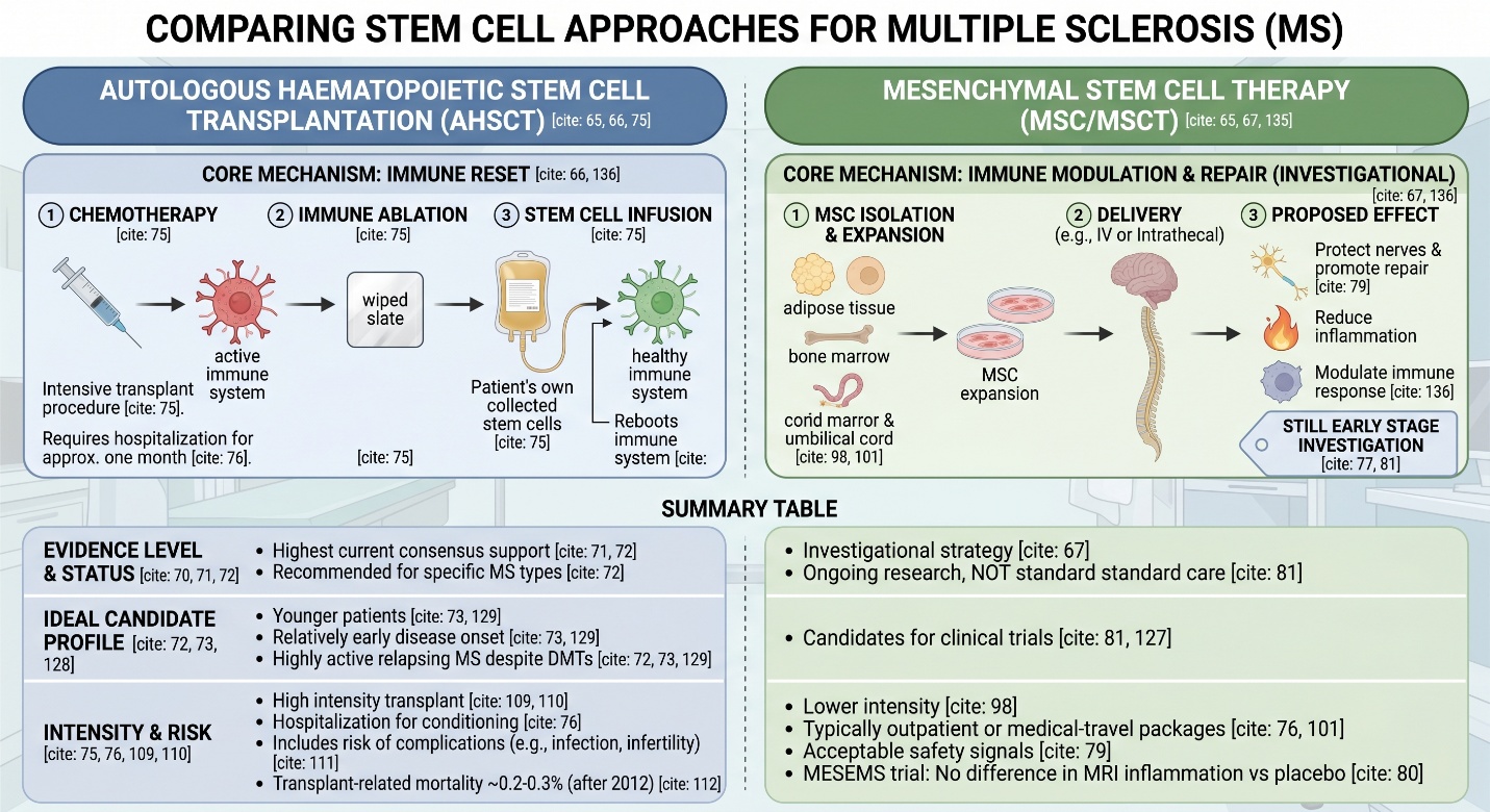 The complication is that “stem cell therapy for multiple sclerosis” is not one single thing. In real medicine, the two big categories are autologous haematopoietic stem cell transplantation (AHSCT) and mesenchymal stem cell therapy (MSC/MSCT), and they are not interchangeable. AHSCT is the more intensive, transplant-based approach aimed at rebooting the immune system. MSC therapy is a separate investigational strategy being studied for immune modulation and repair. Good writing on multiple sclerosis should separate those worlds clearly, because a good stem cell clinic conversation starts with precision, not branding.