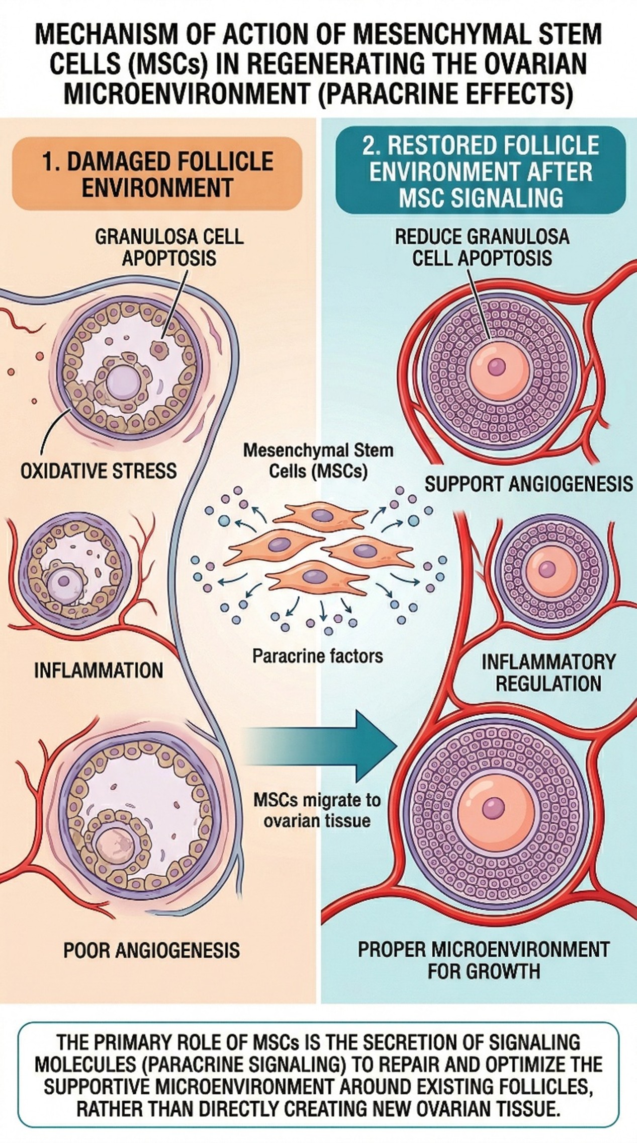 The reason stem cells continue to be studied in ovarian medicine is not hard to understand. According to reviews published in 2025, mesenchymal stem cells are thought to have relevance in ovarian dysfunction because they might migrate toward the injured ovarian tissue. They can help hormone production and thus reduce apoptosis in granulosa cells. They are also able to support angiogenesis, make proper inflammatory regulation possible at sites where initialize to develop into follicles, and present an environment that serves for such growth. It should be emphasized that most of these plausible roles are believed to reside exclusively in paracrine signaling, rather than a matter of simply creating fresh ovarian tissue. That makes the field scientifically interesting, even if it does not make it clinically settled.