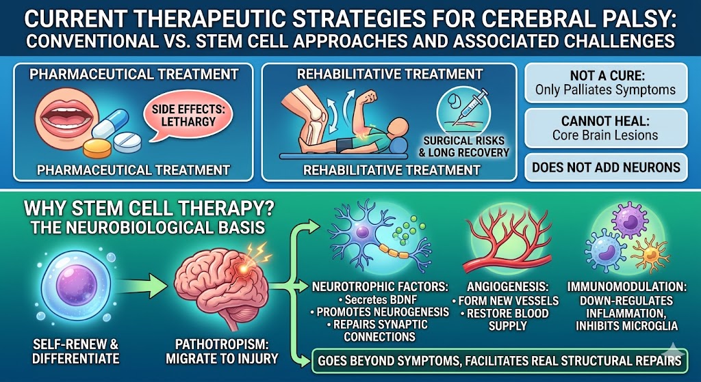 Supportive therapies for treatment of symptoms of Cerebral Palsy consist of a number of relatively straightforward techniques like pharmaceutical treatment using oral muscle relaxants for reduction of spasticity or even rehabilitative treatment for the avoidance of loss of flexion of joints. Such methods, amongst themselves or when employed together, have inherently characteristic limitations. They do not provide a cure. They only palliate symptoms. They do not and cannot heal the core brain lesions. Side effects of medications may include extreme lethargy and surgical treatments pose long recovery periods and increased the risk of infections. Most importantly, unlike Stem Cell interventions, these conventional treatments do not add new neurons or repair broken synaptic connections to the central nervous system.