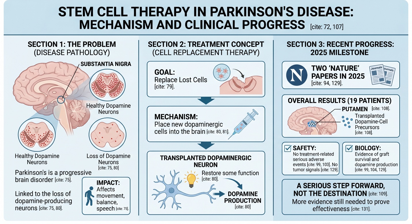 The most important recent development is that two independent Nature papers in 2025 reported early human trial data for Parkinson’s cell therapy. Nature’s accompanying analysis summarized the message clearly: transplanting dopamine-releasing neurons into the brain is promising, the two trials supported safety, but more evidence is still needed to prove effectiveness. That is probably the single best one-line summary of the field right now.