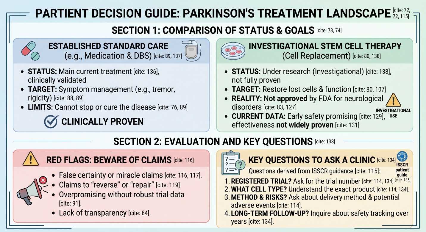 This is where the keyword stem cell clinic becomes useful in a practical way. A credible clinic conversation about Parkinson’s should sound cautious, specific, and trial-aware. It should be clear about whether the treatment is part of a registered clinical trial, what cell type is being used, how the cells are delivered, what surgery and immunosuppression may be involved, what outcomes are being measured, and what long-term follow-up exists. ISSCR’s patient guide exists for exactly this reason: to help patients make informed decisions about stem cell treatments and clinical trials rather than relying on broad promotional claims.